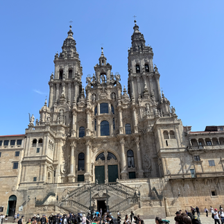 I came to a point where I had to cross the street, I could see that this was the last leg before I got the the Cathedral. There was a crosswalk to maneuver across, and on the other side of the street were cafes, and a sea of people. The light for the crosswalk took forever, but once actors, I cut through some narrow streets filled with people, most of them appeared to be travelers like me. You could tell from the Camino paraphernalia they were wearing that they picked up at a gift shop. I was bobbing and weaving and eventually I made my way to the plaza of the Cathedral. There was a gazillion people there, everyone taking pictures and whooping and howling. It was quite the spectacle. I admit it, it was actually a bit underwhelming for me. I don't know what I was expecting, BUT I half expected to have a ticker tape parade or confetti falling from the sky. Crap, balloons or bubbles would have been good enough. But nope, nuttin. I was standing there looking at the Cathedral and wondering, now what? That's when someone touched me on the shoulder and said, "You made it"! It was Mrs. Nash.